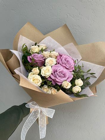 Утонченные одноголовые розы в окружении нежно-белых кустовых роз. Эта композиция может быть как выражением самых теплых чувств, так и прекрасным дополнением к Вашим искренним поздравлениям. Такой букет весьма практичен и подойдет практически для любого повода.
